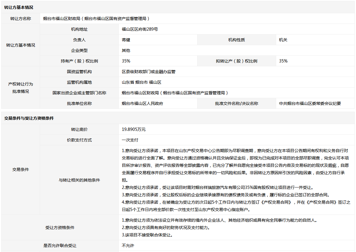 轉(zhuǎn)讓方: 煙臺市福山區(qū)財(cái)政局(煙臺市福山區(qū)國有資產(chǎn)監(jiān)督管理局)