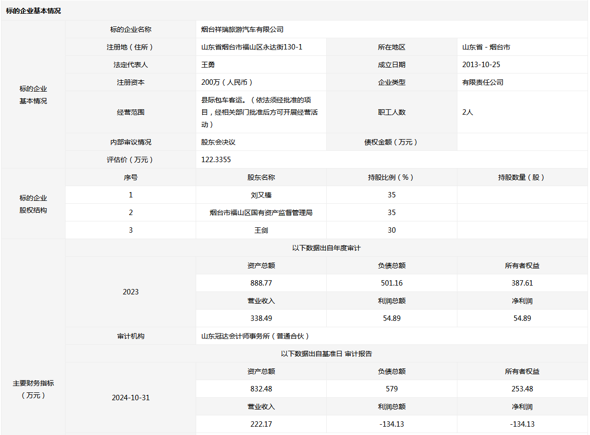 煙臺祥瑞旅游汽車有限公司35%國有股權