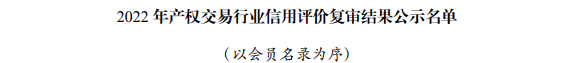 2022年產(chǎn)權(quán)交易行業(yè)信用評價(jià)復(fù)審結(jié)果在全國行業(yè)信用公共服務(wù)平臺(tái)和中國產(chǎn)權(quán)網(wǎng)進(jìn)行公示,煙臺(tái)聯(lián)合產(chǎn)權(quán)在協(xié)會(huì)信用評價(jià)復(fù)審中,繼續(xù)維持AAA級評定不變。